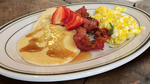 Two eggs any style, crispy bacon, two fluffy pancakes, and a fresh cup of coffee