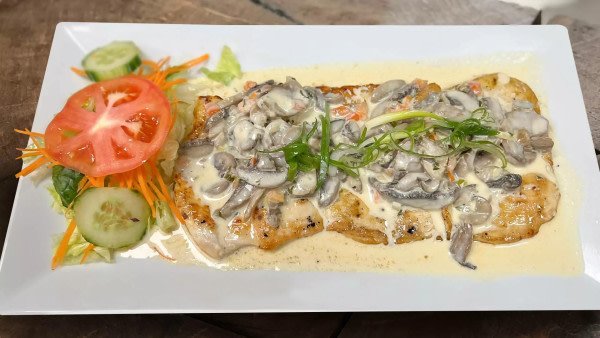 Tender grilled chicken breast topped with our creamy mushroom sauce, served with white rice, French fries, and fresh salad — rich, savory, and comforting