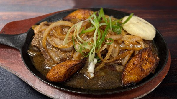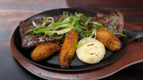 Marinated, tender grilled beef steak topped with sautéed caramelized onions, served with white rice, beans, sweet plantain, and a fresh salad — classic comfort with bold flavor