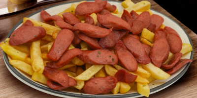 Sliced hot dog franks over crispy French fries — simple, savory, and always satisfying