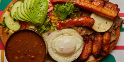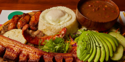 White rice crowned with a fried egg, beans, skirt steak, crispy pork pancetta, sausage, creamy avocado with fresh salad, and a delightful corn cake — a Colombian feast