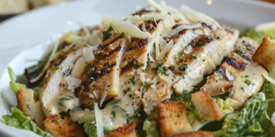 Classic Caesar salad topped with tender grilled chicken, crisp romaine, parmesan cheese, and croutons