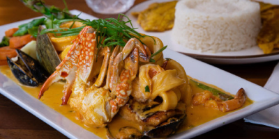 A traditional Colombian-style casserole made with a rich blend of shrimp, calamari, clams, and fish, simmered in a savory seafood broth — served with white rice, plantains, and fresh salad