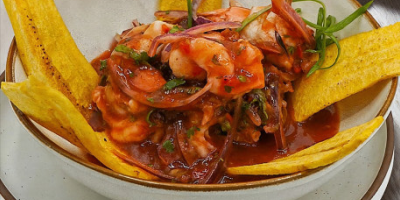 Corvina fish, shrimp, calamari, and octopus dance in lime juice, red onions, and rocoto pepper sauce, accompanied by potato, sweet potato, corn, and plantain chips