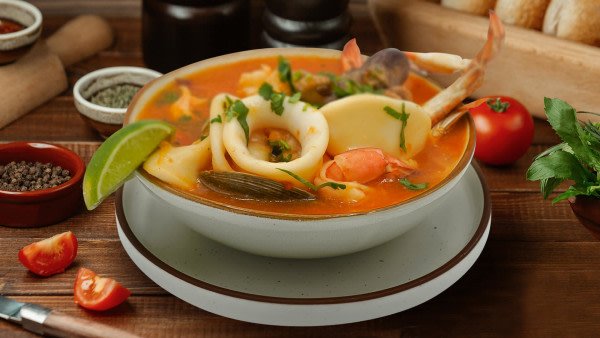 Traditional Peruvian-style seafood soup made with a rich mix of shrimp, fish, clams, and calamari simmered in a bold, spicy hot pepper broth — comforting, hearty, and full of coastal flavor