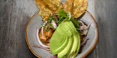 Crunchy pork pancetta with lime juice, onion, cilantro, and peppers, paired with creamy avocado and crispy green plantain