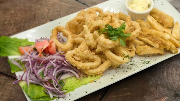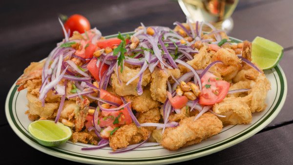 Serves 2, crispy, golden-fried mix of breaded seafood topped with zesty Peruvian criolla salad, served with yuca sticks and a side of spicy house sauce