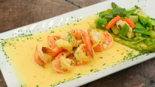 Jumbo shrimp sautéed in a rich, creamy garlic sauce, served with white rice, sweet plantain, and fresh salad — bold, buttery, and full of flavor